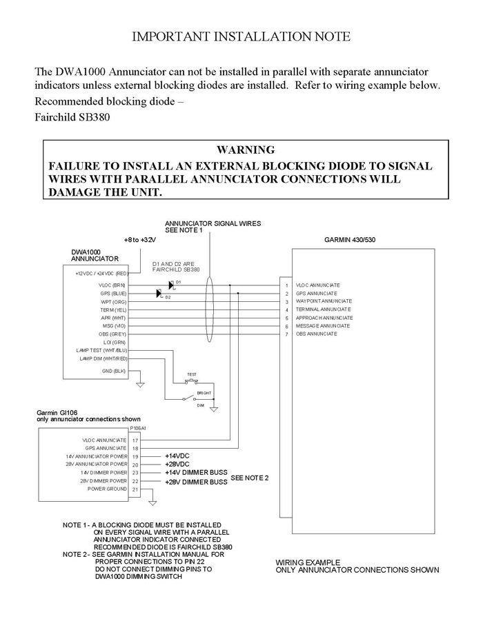 Failure to install an external blocking diode to signal wires with parallel annunciator connections will damage the unit. Please refer to this wiring example.